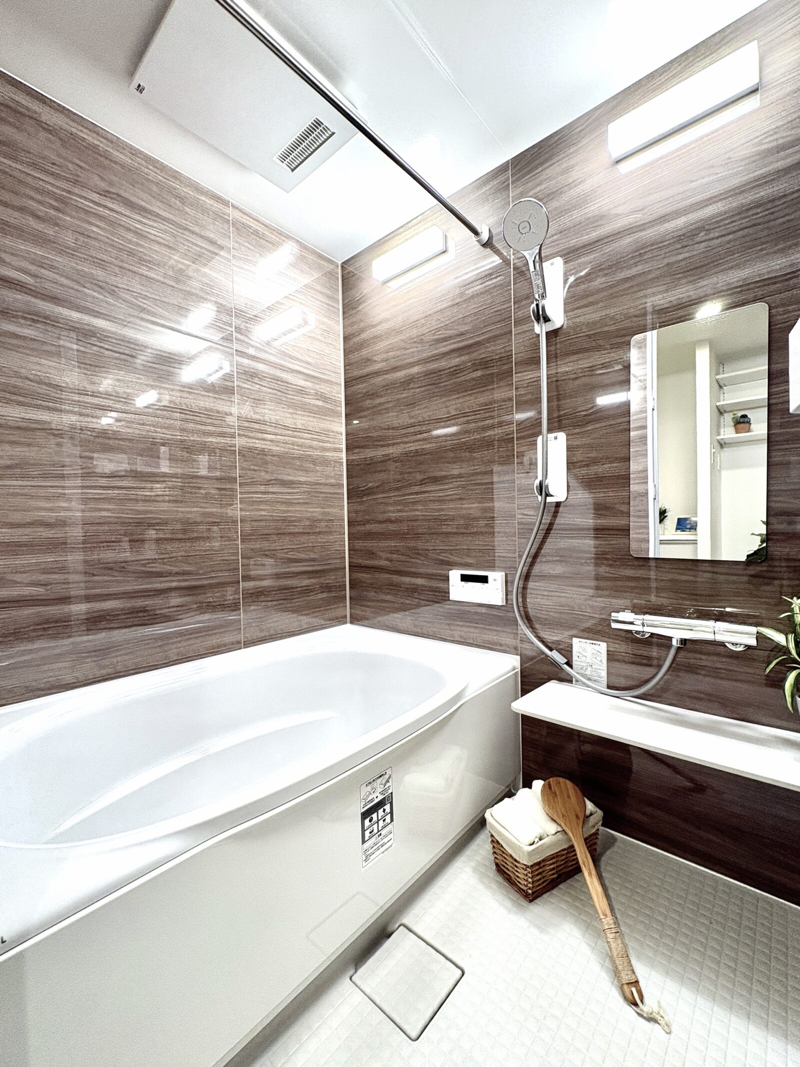風呂1317タイプのユニットバスウォルナット調のパネルが落ち着いたバスタイムを演出します。浴室乾燥・暖房機付き。