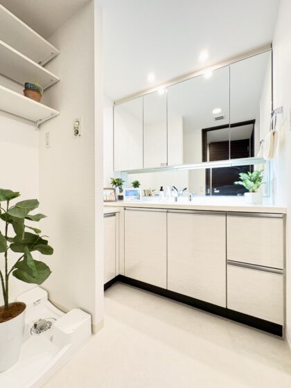 L型の洗面台のため、収納が豊富で、ゆったりとした水回りです。洗濯パン上部には、可動棚を設置、タオルや小物の整理に便利です!