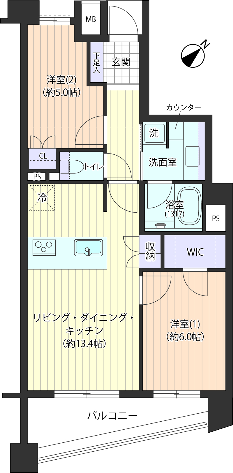 | 間取内容 | LDK13.4畳 洋室6.0畳 洋室5.0畳 2LDK+WIC |