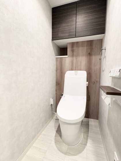 温水洗浄便座付き、リモコンで操作しますので、操作のしやすさもポイントです。吊戸棚があり、小物の収納に便利です!